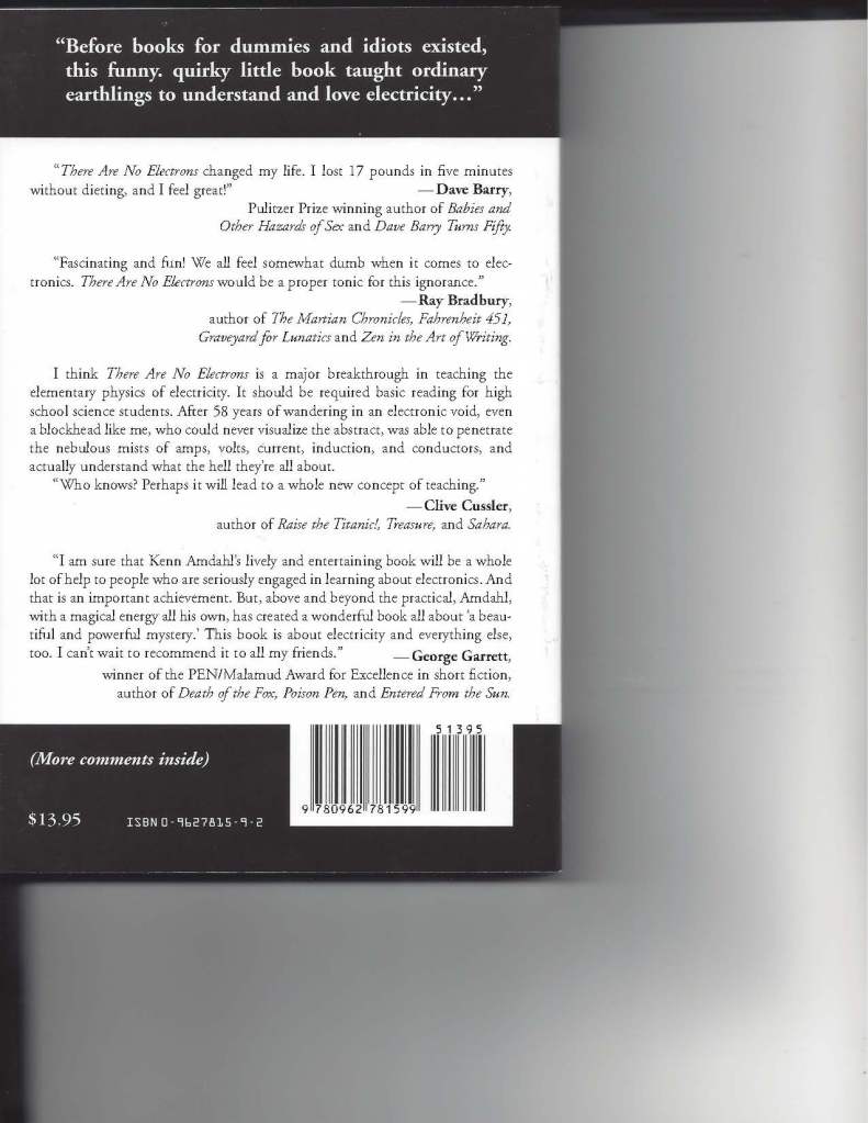It may be the only “introduction to electronics books” with back cover comments by Dave Barry, Ray Bradbury, Clive Cussler, and George Garrett, as well as recomendations from Robert Hazen, Bob Mostafapour, Dr. Roger Young, Dr. Wayne Green, Scott Rundle, Brian Battles, Michelle Guido, Herb Reichert and Emil Venere.